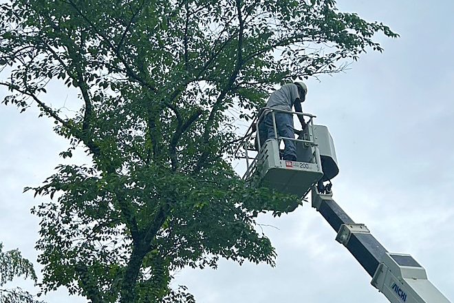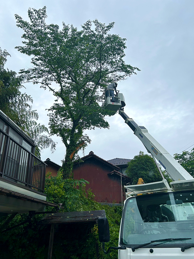 安全確保のため、まずは高所作業車を使用し、枝を丁寧に切り落としていきました。特に屋根やベランダ、電線への接触には注意を払いながら、上部から段階的に伐採を進めました。伐採された枝や幹は地上で速やかに撤去し、敷地内の安全を確保しながらの作業となります。